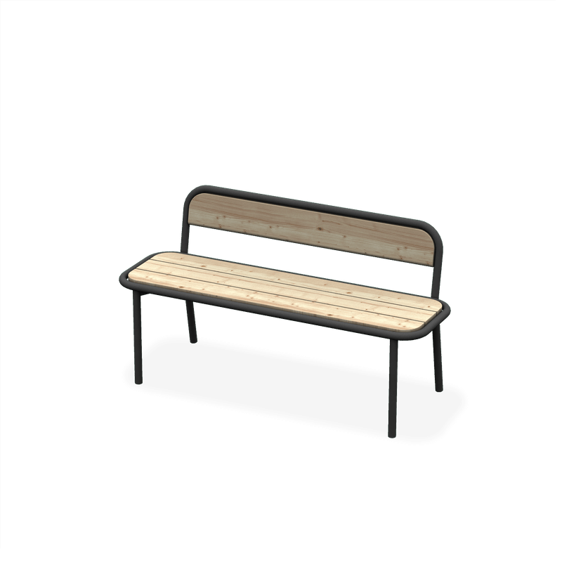 Julkisen tilan kestävä kotimainen penkki selkänojalla lehtikuusesta ja teräksestä.